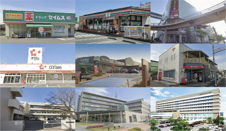 近隣には便利で多様な生活施設がいっぱいです。歩いて数分のご近所にはコンビニ大手のセブンイレブン&ファミリーマート、そしてドラッグストアセイムスは、調剤薬局が併設しおりとても便利です。スーパーもスーパーオザム河辺店(650m)と業務スーパー小作店(850m)が徒歩圏内に2店!河辺駅前には西友とイオン、そして大人気の温泉「花の湯」。また、市役所、図書館、体育館、小学校、中学校、そして医療センター、など暮らしの拠点がすべて2km以内に集まった安心の環境です。